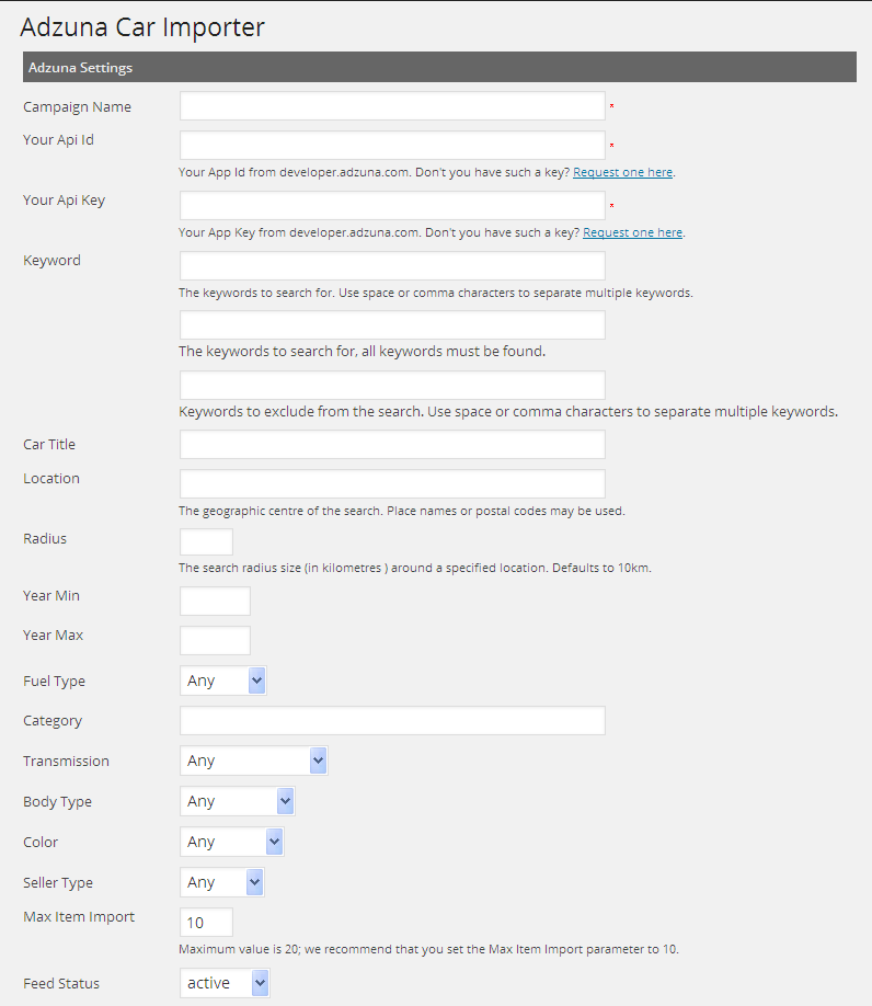 - Activate the Adzuna Car Importer WordPress Plugin through the ‘Plugins’ menu in WordPress